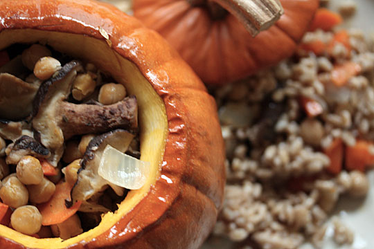 On Thanksgiving, expressing gratitude through a whole baked pumpkin stuffed with chewy barley and hearty root vegetables can be the beginning of a stellar holiday season.