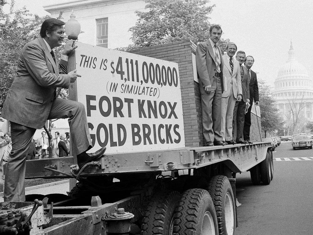 Texas Republican Rep. Ron Paul (fourth from right), Idaho Republican Rep. George Hansen (left) and other members of Congress gather around a truck loaded with 44,300 simulated gold bricks on April 25, 1979, in Washington to indicate their opposition to the estimated $4.1 billion it would cost U.S. taxpayers to give away the Panama Canal.