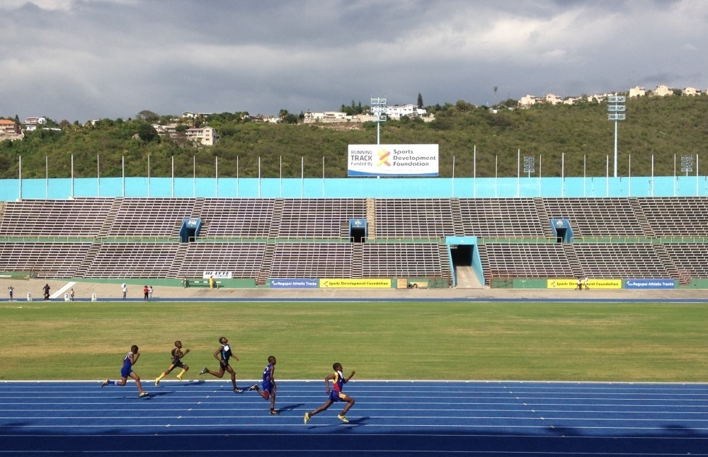 At a primary and middle school track meet in Kingston's National Stadium, crowds of teens and preteens decked out in school colors blast plastic horns and cheer on their runners and jumpers.