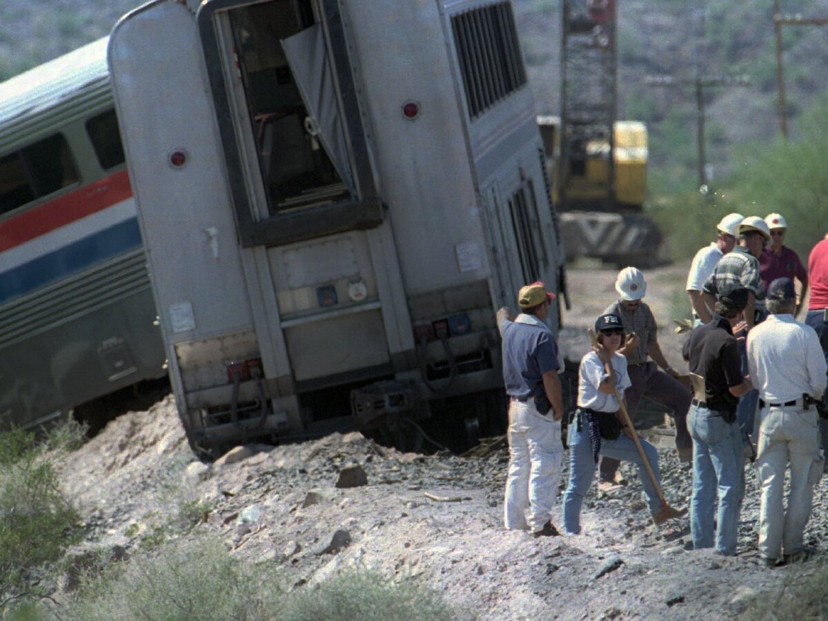 On October 9, 1995, the Amtrak Sunset Limited passenger train derailed in the Arizona desert over 50 miles from Phoenix. Nearly 100 passengers were injured and one Amtrak employee was killed. Courtesy of FBI hide caption