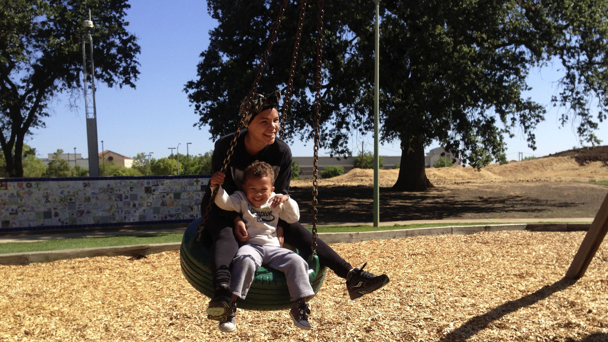 Micaela Torres and 2-year-old Jakai Johnson swing underneath a surveillance camera at Miwok Park in Elk Grove, Calif. The city's police department collects more than 100 video feeds from across the city. Steve Henn/NPR hide caption