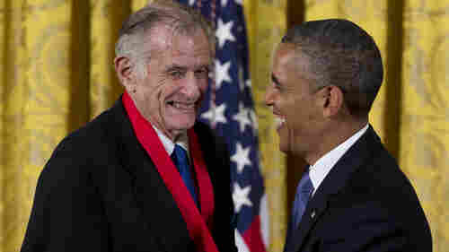 President Barack Obama laughs with Frank Deford as he awards him the 2012 National Humanities Medal for transforming how we think about sports, during a ceremony in the East Room of White House on July 10, 2013 Carolyn Kaster/AP hide caption