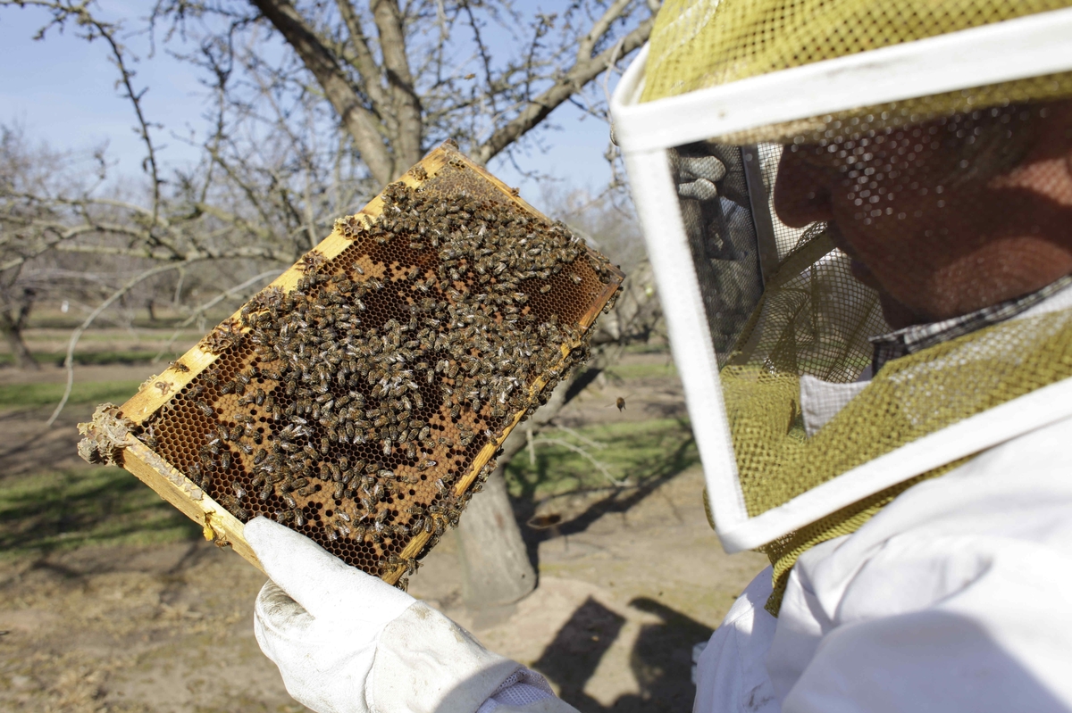 A bee inspector checks on a frame of bees to assess the colony strength near Turlock, Calif., in February. More than 30 percent of America's bee colonies died off over the winter.