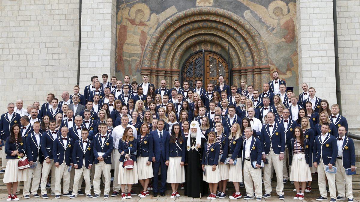 Russian Olympians, along with coaches and other officials, pose outside the Assumption Cathedral in Moscow on Wednesday before heading to Brazil. Russia had planned to send nearly 400 athletes to the Rio Games, but more than 110 have been banned because of a doping scandal.
