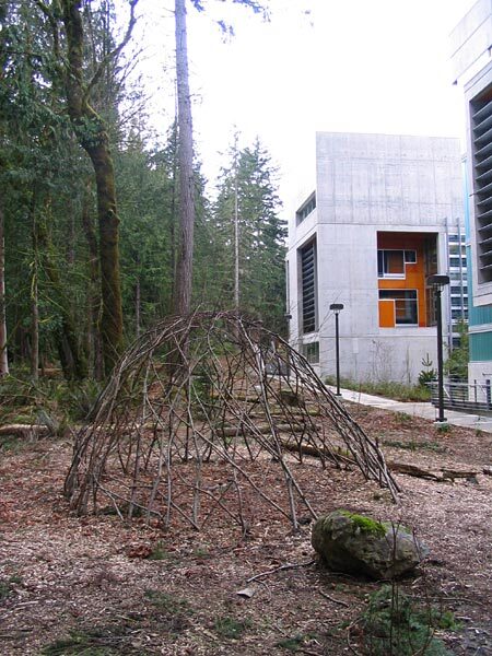A geodesic dome outside a building at Evergreen State College, built from fallen branches.