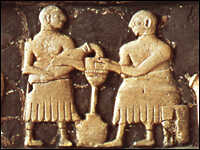 Milking scene from the Temple of Ninhursag, from Tell al Ubaid, c. 2400 B.C. hide caption