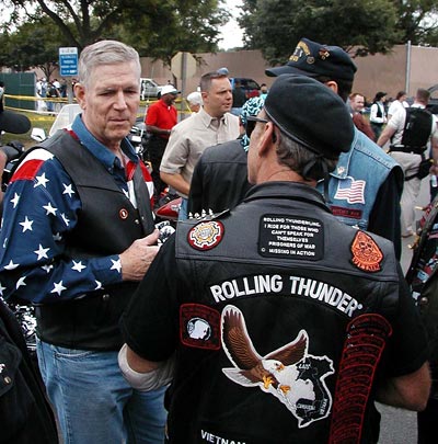 Joint Chiefs Chairman Air Force Gen. Richard Myers, left, speaks with a fellow Vietnam vet during the annual Rolling Thunder ride in Washington, May 30, 2005.