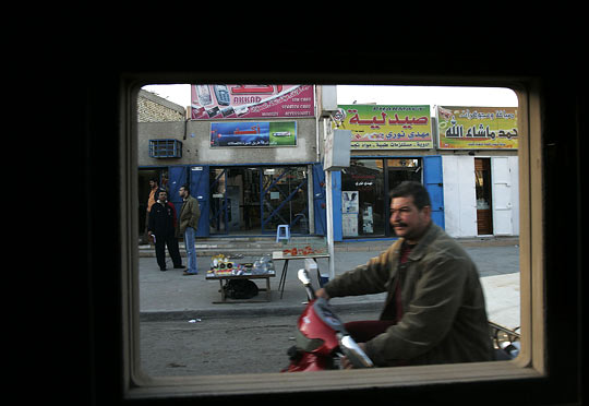 Hondros has been writing a blog to accompany some of his more recent photos. One entry, from earlier this month, is called "A Drive Through Baghdad". It features photos that are all framed by Humvee windows.