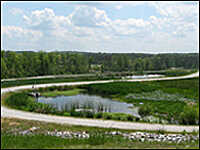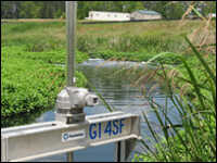 The water to the wetlands is piped four miles from the treatment plants. Shown here is a gate that regulates water among the two dozen ponds in the preserve. In the distance, water enters the pond.