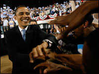 Illinois Sen. Barack Obama greets the crowd at a rally at the North Carolina State University arena on Tuesday in Raleigh. Mark Wilson/Getty Images hide caption