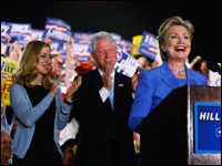 New York Sen. Hillary Clinton speaks as her husband, former President Bill Clinton, and daughter, Chelsea, stand behind her at her primary night event in Indianapolis. Joe Raedle/Getty Images hide caption