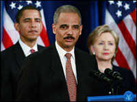 Attorney general nominee Eric Holder speaks as President-elect Barack Obama and Sen. Hillary Clinton (D-NY) stand by at a news conference Dec. 1 in Chicago.