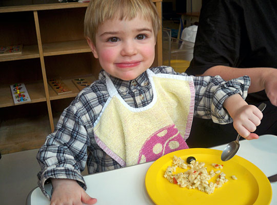 Maxime enjoys his pasta salad during lunchtime at La Margeride day care in Paris.