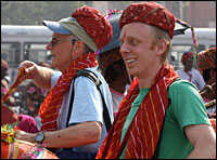 Mel and Mike White perform a traditional Rajathani Horse Dance in full costume during a challenge for The Amazing Race.