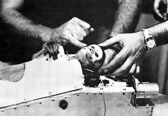 Miss Baker, a squirrel monkey, is tucked inside her capsule and ready to launch into space aboard a Jupiter missile. She traveled into space on May 28, 1959, along with Able, an American-born rhesus monkey.