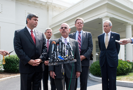 California Rep. Henry Waxman (center) stands alongside fellow Democratic lawmakers outside the White House on Tuesday, after their meeting with President Obama about health care.