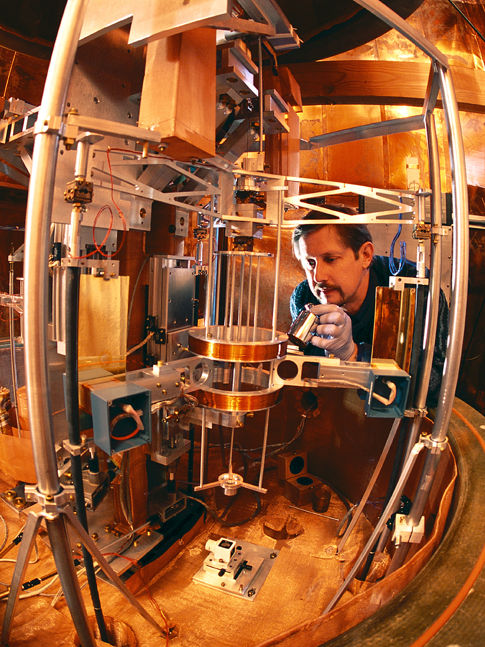 Physicist Richard Steiner adjusts the watt balance. This extremely sensitive scale can detect changes as small as ten-billionths of a kilogram.