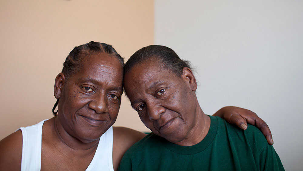 Before evacuating from Katrina, Bobbie Jennings (right) lived next door to her twin sister, Gloria Williams, in the public housing that existed on the same site as Harmony Oaks in New Orleans. While Jennings likes the actual apartment, she says she is unhappy with the new development because the new apartments do not provide the same sense of community as before. Katie Hayes/NPR hide caption