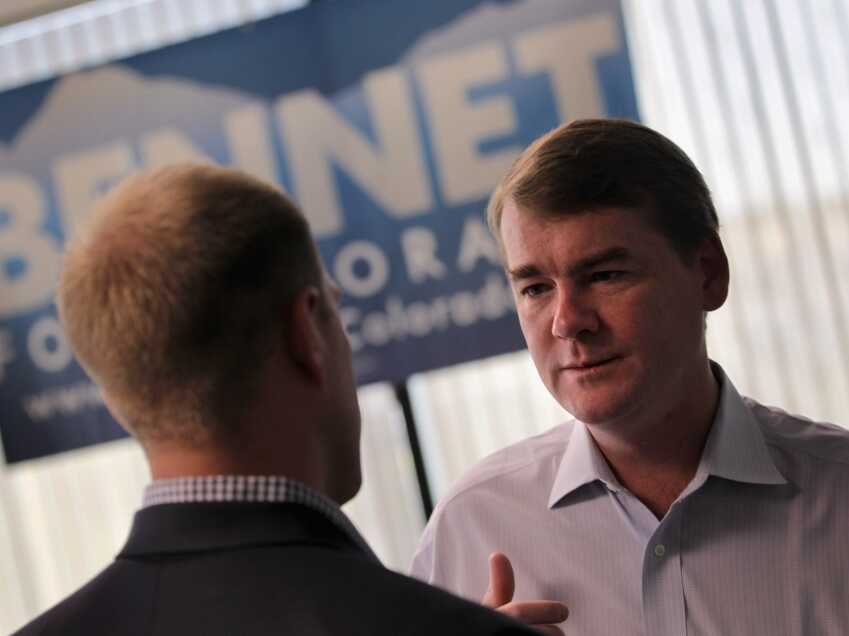 U.S. Sen. Michael Bennet (D-CO) meets with an aide at his campaign headquarters in Colorado. Bennet was the subject of an attack ad paid for by American Crossroads. John Moore/Getty Images hide caption