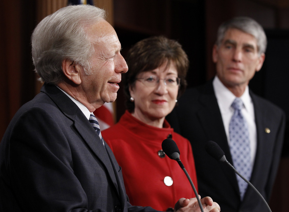 Sen. Joseph Lieberman (I-CT), with Sen. Susan Collins (R-ME) and Sen. Mark Udall (D-CO), talks about the passage of legislation to repeal "don't ask, don't tell" at the Capitol on Saturday.