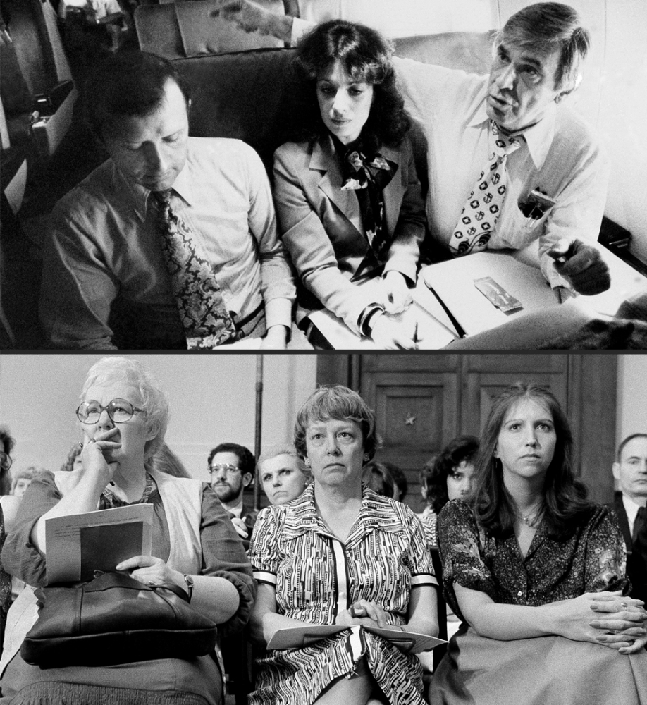 At top, Rep. Leo Ryan (far right) flies to Guyana on Nov. 18, 1978, along with consultant James Schollart and aide Jackie Speier. In 1979, Erin Ryan (at right in lower image) attended a congressional hearing on the Jonestown killings.