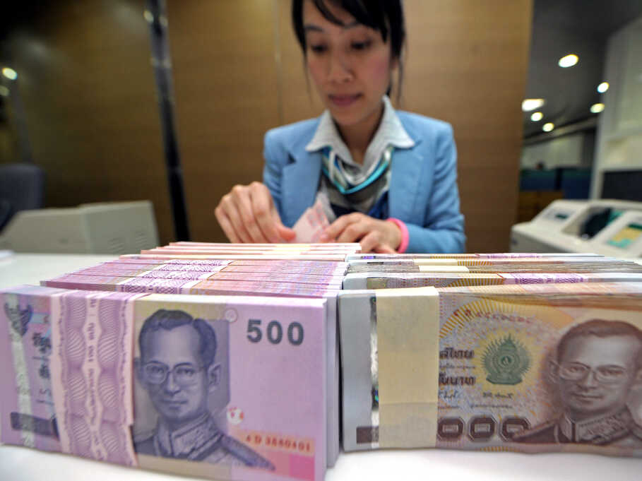 An employee counts bundles of Thai bahts at Krung Thai Bank in Bangkok in October. A tidal wave of money is pouring into Asia and driving up regional currencies.
