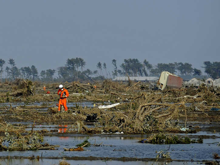 A Japanese rescuer walking across an area devastated by the tsunami in Sendai on Sunday. The massive earthquake and tsunami on Friday left more than 2,000 dead with thousands more unaccounted for as shortages for food and fuel in many parts of eastern Japan create havoc.