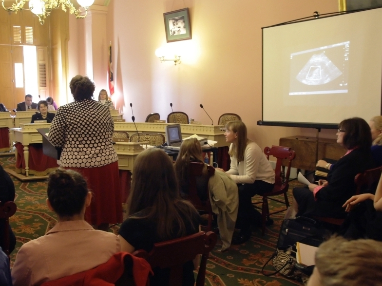 Jay LaPrete/APRecently, two pregnant women got ultrasounds before a packed committee hearing room. The images were displayed on a screen as technicians struggled to find the heartbeat of a 9-week-old fetus.