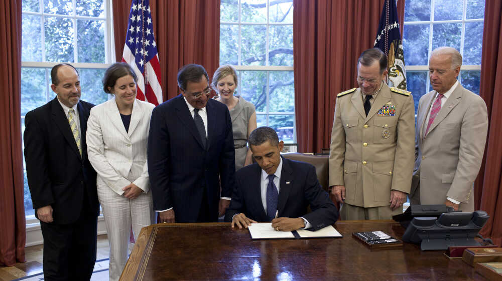 President Barack Obama signs the certification stating that the statutory requirements for repeal of DADT have been met, in the Oval Office, July 22, 2011. Pete Souza/Official White House Photo hide caption
