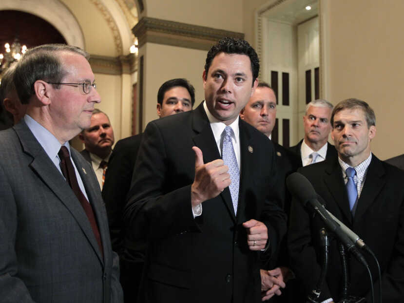 Rep. Jason Chaffetz (R-UT, center) and other House Republicans react to passage of the Cut, Cap and Balance bill on July 19. Chaffetz ultimately voted against the final debt-ceiling bill. J. Scott Applewhite/AP hide caption