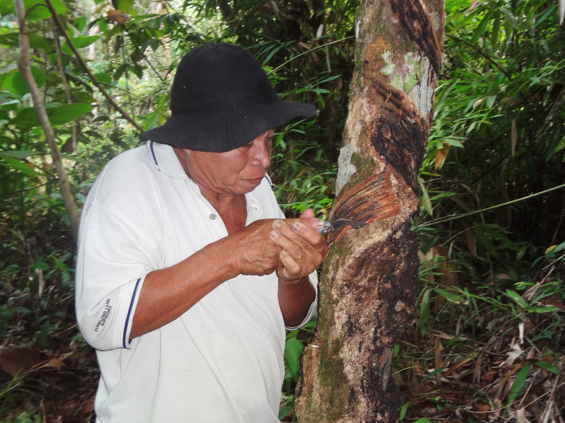 Layan Lujum, 80, Sekendal's village chief, cuts grooves in one of his rubber trees. Indigenous people in Borneo say they can make more money selling the latex sap from rubber trees than working on the area's palm oil plantations.