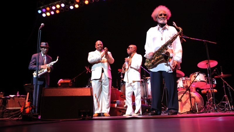 Rollins (far right) on stage at his 80th-birthday concert in New York City. Also pictured (left to right): Ornette Coleman, Christian McBride, Roy Haynes.