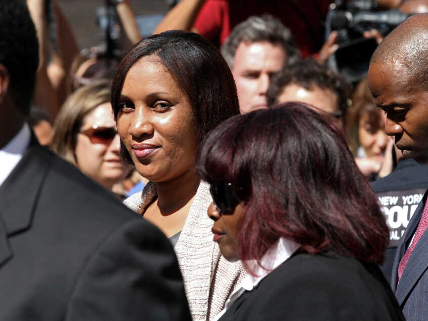 Hotel housekeeper Nafissatou Diallo, who accused former International Monetary Fund head Dominique Strauss-Kahn of sexual assault, leaves a New York court building Aug. 22, 2011. Craig Ruttle/AP hide caption