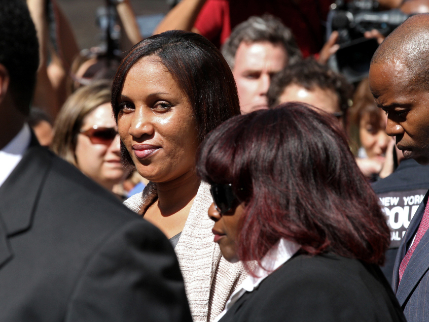 Hotel housekeeper Nafissatou Diallo, who accused former International Monetary Fund head Dominique Strauss-Kahn of sexual assault, leaves a New York court building Aug. 22, 2011.