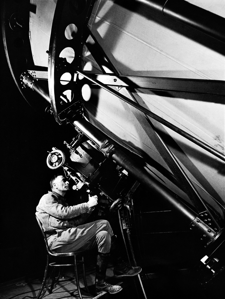 American astronomer Edwin Hubble looks through the eyepiece of the 100-inch telescope at the Mount Wilson Observatory in Los Angeles, 1937. In 1929, Hubble proposed that the more distant a galaxy is, the faster it appears to be receding from us, a concept that has become known as Hubble's law.