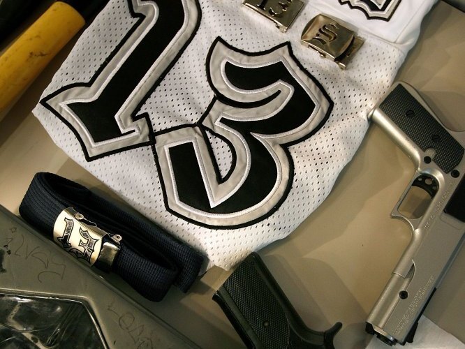 Weapons and paraphernalia from gangs are displayed during a news conference in 2006. Authorities in Fairfax, Va., have brought five prostitution cases in the past year against gangs. One member of the MS-13 gang was recently sentenced to life in prison for sex trafficking.