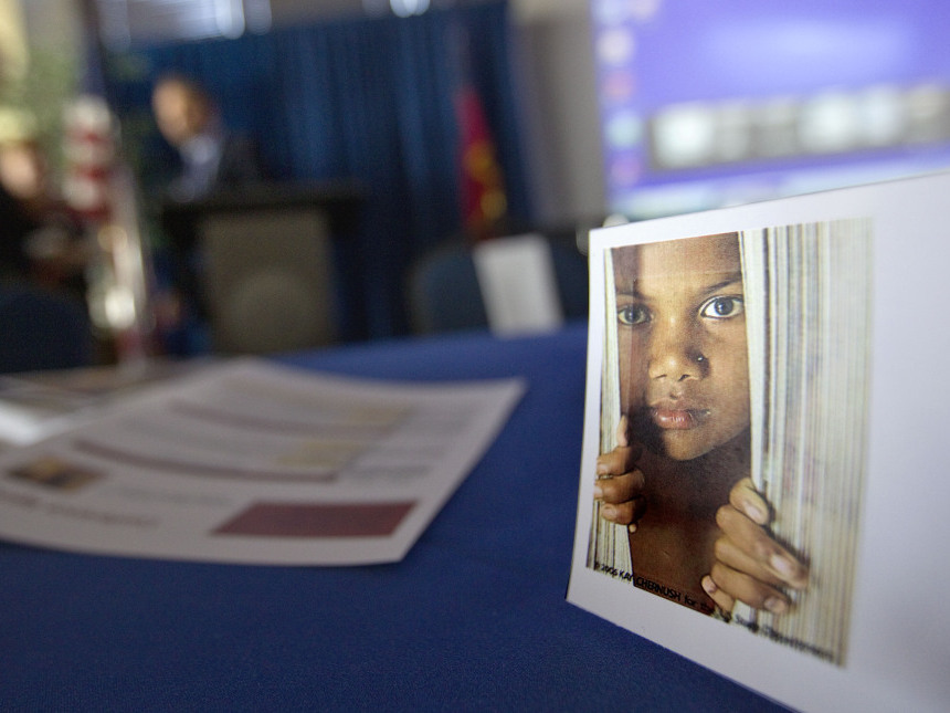A placard featuring the photo of a child sits on a table during a conference on human sex trafficking last month in Atlanta. In Fairfax County, Va., gang members who have forced girls as young as 12 into prostitution are being sent to prison. Prosecutors there expect to bring more sex trafficking cases against gang members over the next several months. David Goldman/AP hide caption