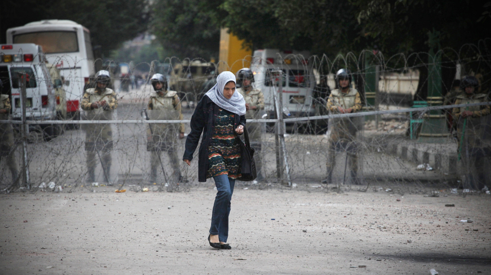 A woman walks past Egyptian military near Tahrir Square in Cairo, Egypt, on Sunday. Protesters have clashed with security forces in the days leading up to Monday's parliamentary elections, and women are being targeted.