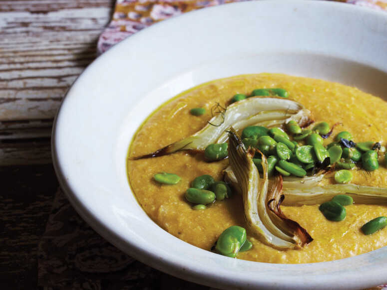 Savory Grits with Sautéed Broad Beans, Roasted Fennel, and Thyme