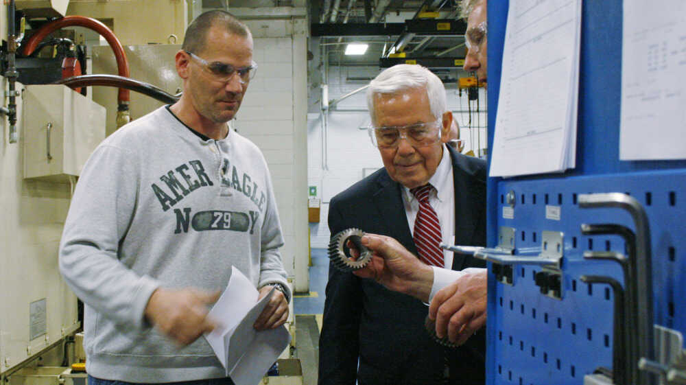 Sen. Richard Lugar (right) meets with workers at the Oerlikon Fairfield manufacturing plant in Lafayette, Ind., on Feb. 24. Reuters /Landov hide caption