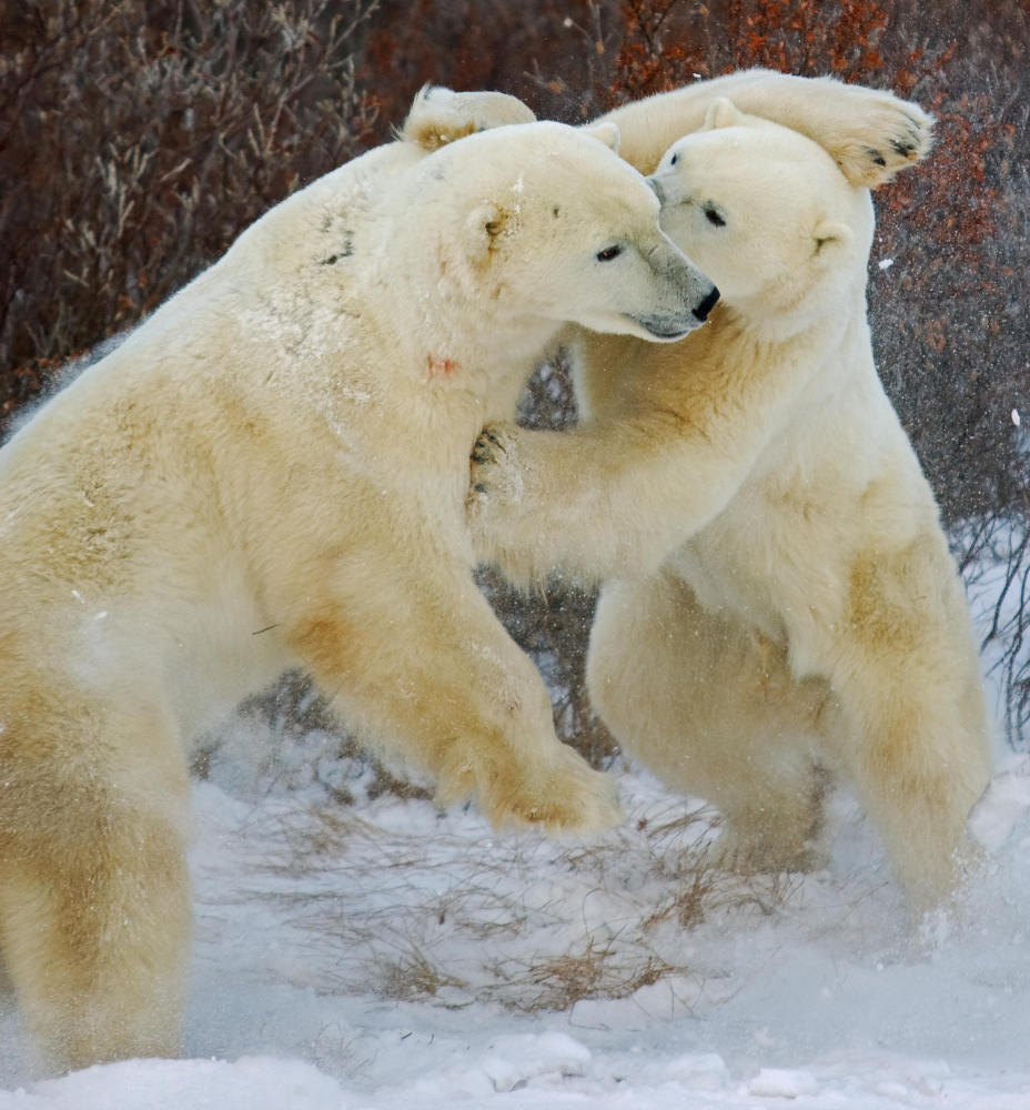 Two polar bears spar on the shoreline of the Hudson Bay in November 2007.