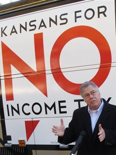 In Kansas, legislators are considering devoting extra funds to tax relief instead of hiring more state workers. Republican state Rep. Joe Patton of Topeka, shown in November, talks about proposals to eliminate the state's income tax.