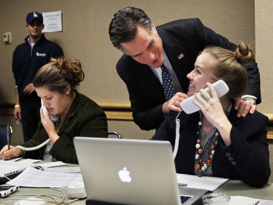 Republican presidential candidate Mitt Romney speaks with a staffer on the night of the Florida primary in January. Now that he's pivoting away from the primaries to the general election, Romney is expected to quadruple his staff soon. Joe Raedle/Getty Images hide caption