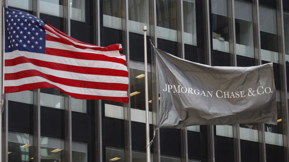 The U.S. and JPMorgan Chase flags wave outside its headquarters in New York on Friday. Eduardo Munoz/Reuters /Landov hide caption