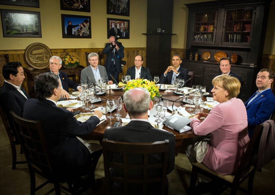 President Obama speaks with other G-8 leaders at Camp David in Maryland during the summit on Friday.