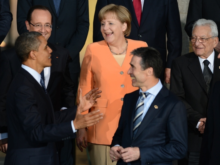President Obama talks to German Chancellor Angela Merkel, French President Francois Hollande (upper left), NATO Secretary-General Anders Fogh Rasmussen (center) and other leaders during the official photo at Soldier Field in Chicago during the NATO summit Sunday. Jim Watson/AFP/Getty Images hide caption