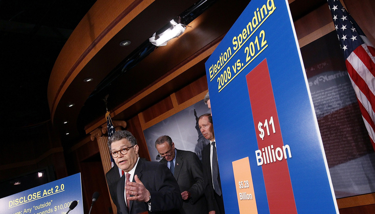 Al Franken of Minnesota was part of a group of Democratic senators at a March news conference announcing legislation "to blunt the worst effects" of the Supreme Court decision that paved the way for the rise of superPACs. Win McNamee/Getty Images hide caption