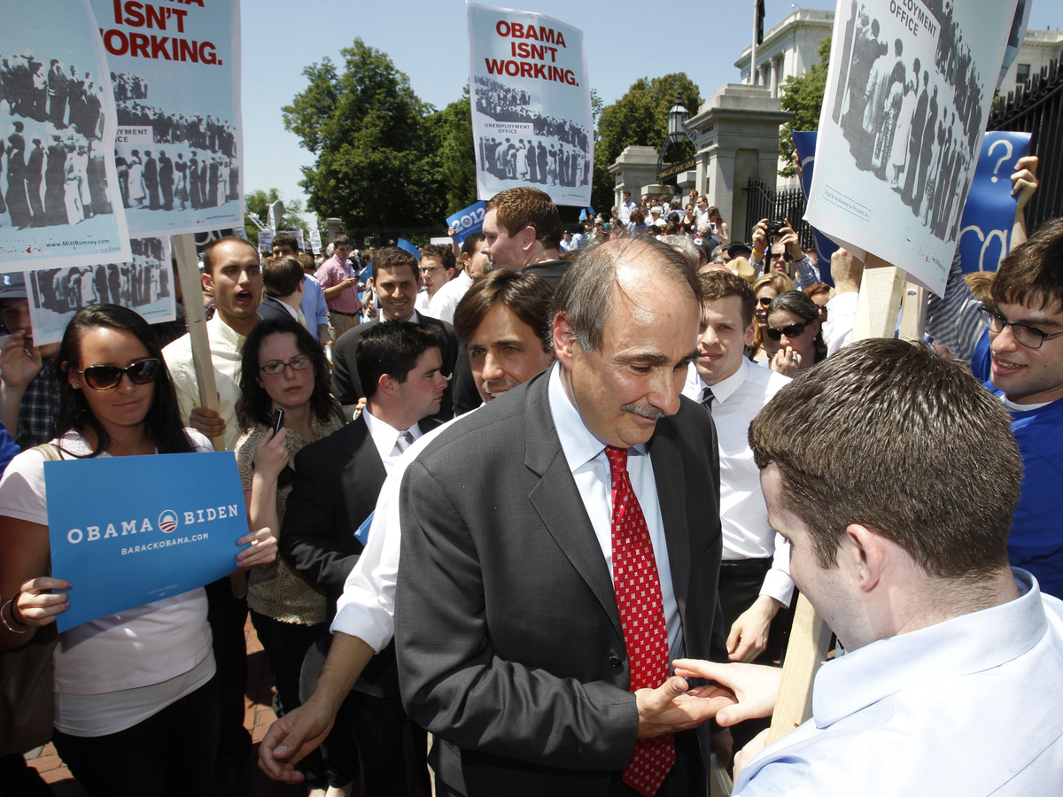 David Axelrod, the Obama campaign's senior strategist (center), stops to shake a demonstrator's hand as he leaves a news conference at the Massachusetts State House in Boston on Thursday. Jessica Rinaldi/Reuters /Landov hide caption