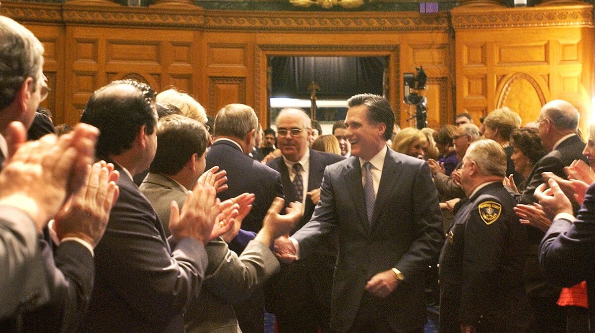 Mitt Romney shakes hands as he walks into the House Chambers during inaugural ceremonies at the State House in Boston in 2003. the Obama campaign sought to focus attention on Romney's tenure as Massachusetts governor.