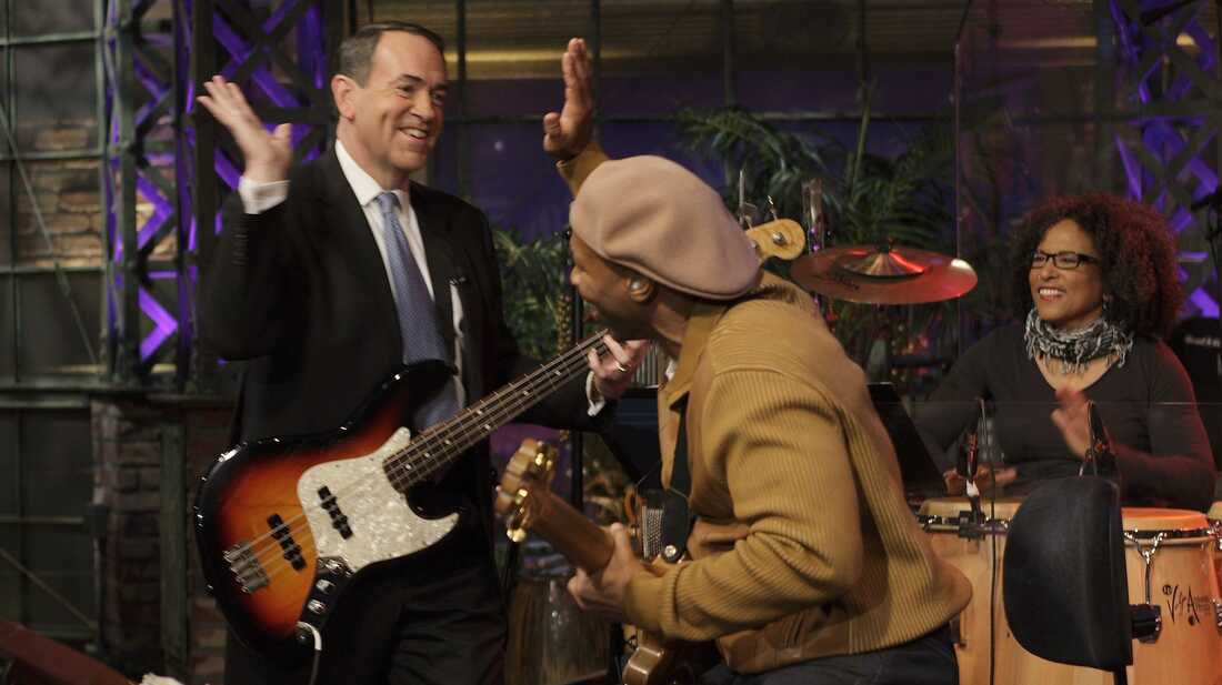 Mike Huckabee sits in on bass with the Tonight Show band in 2008.